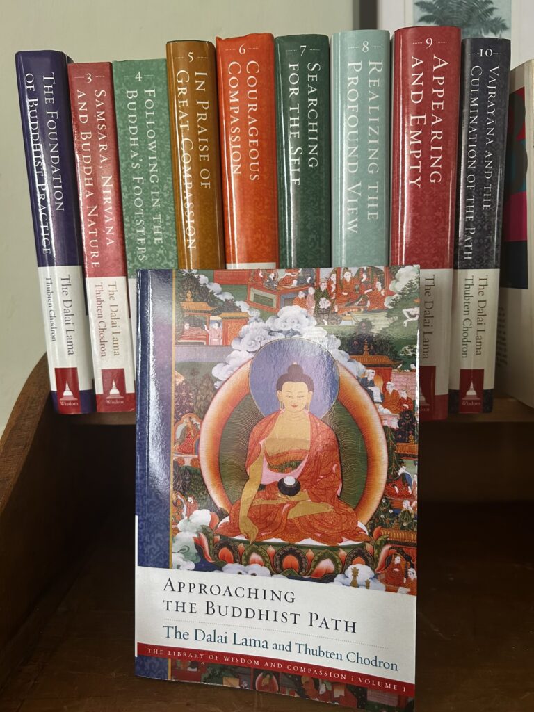 - September 2025: Building work has finally started on creating disabled bathroom access. We have also received a very generous donation from a friend – the complete set of the ‘Library of Wisdom and Compassion’ by HH The Dalai Lama and Thubten Chodron. This wonderful resource for anyone interested in following a Tibetan path will be available to all in our reading room.